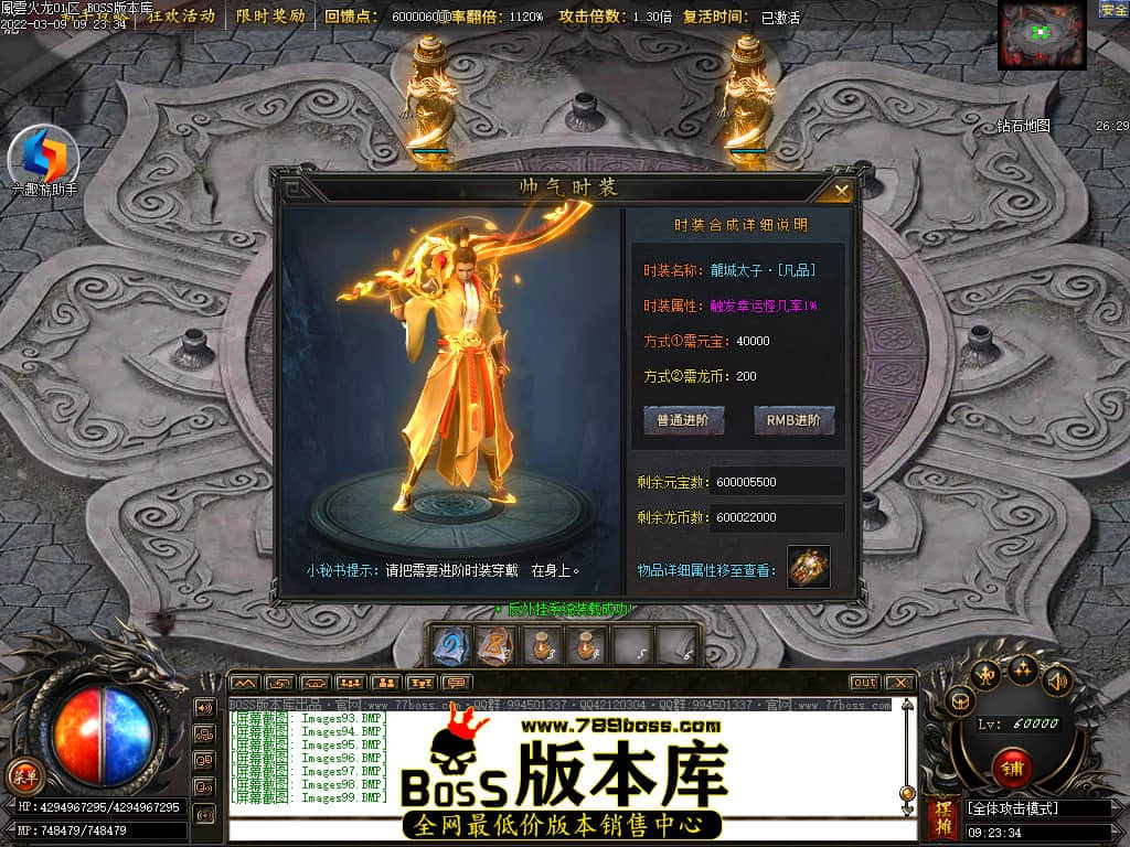 初级起号:充值48元领取黄金会员,附带自动捡物,超级时装,货币回收+20%,送的龙币开启沙捐狂暴即可开始发育!